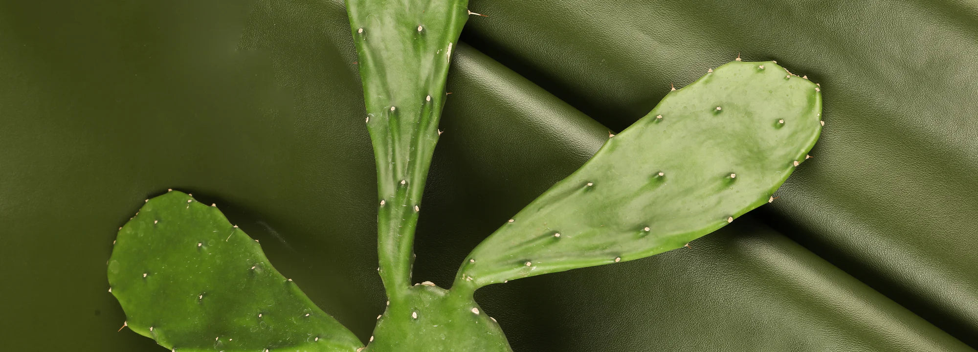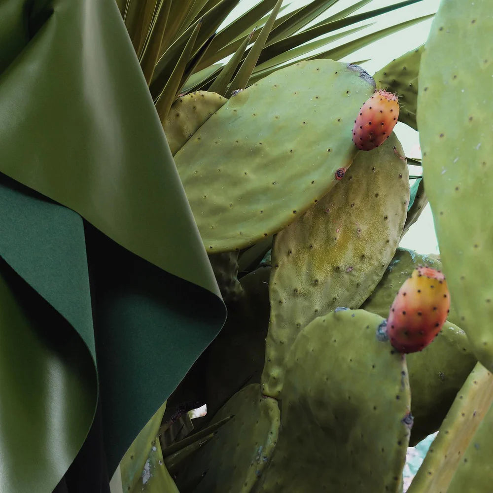 Soft, matte, and sculptural—our cactus leather rivals the best Italian hides in both texture and durability. Grown in the organic fields of Zacatecas, Mexico, this award-winning material is hand-harvested from nopales that require no irrigation, chemicals, or fertilizers. Carbon-negative by nature, it nourishes the soil as it grows and is completely free of toxins.